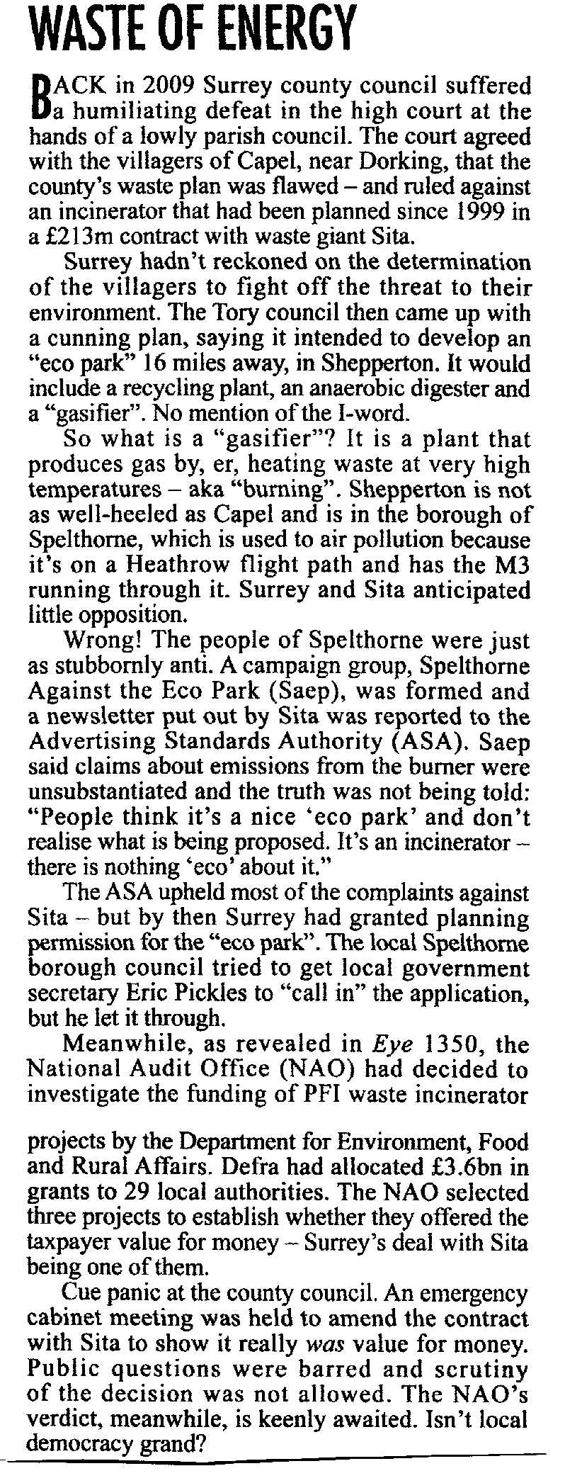 The 'Rotten Boroughs' section of Today's edition of Private Eye puts the spotlight on Surrey County Council's obstinate refusal to back down over the installation of an incinerator at the Charlton Lane Community Recycling Centre; this, despite huge opposition both from local residents and Spelthorne Borough Council.