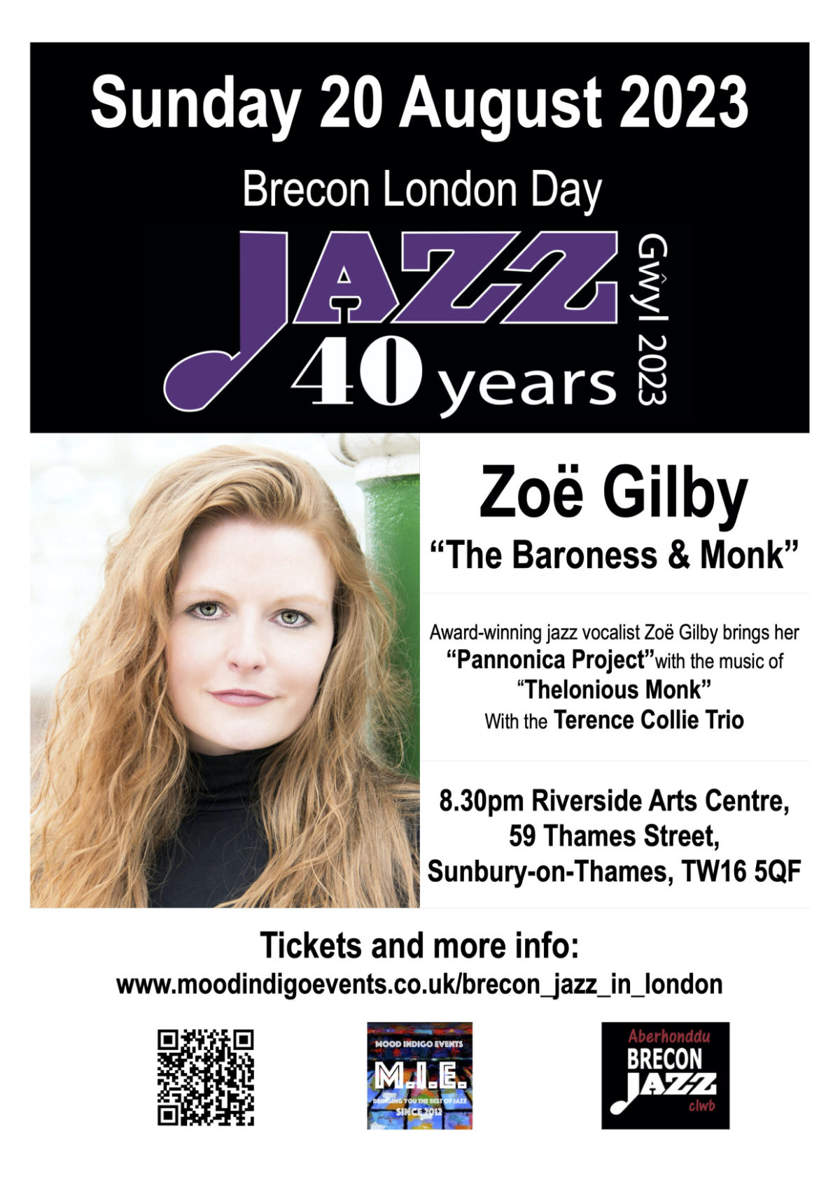 Zoe joins the Terence Collie Trio in a tribute to the legendary composer and pianist Thelonious Monk at the Riverside Arts Centre on Sunday 20th August at 8.30pm.