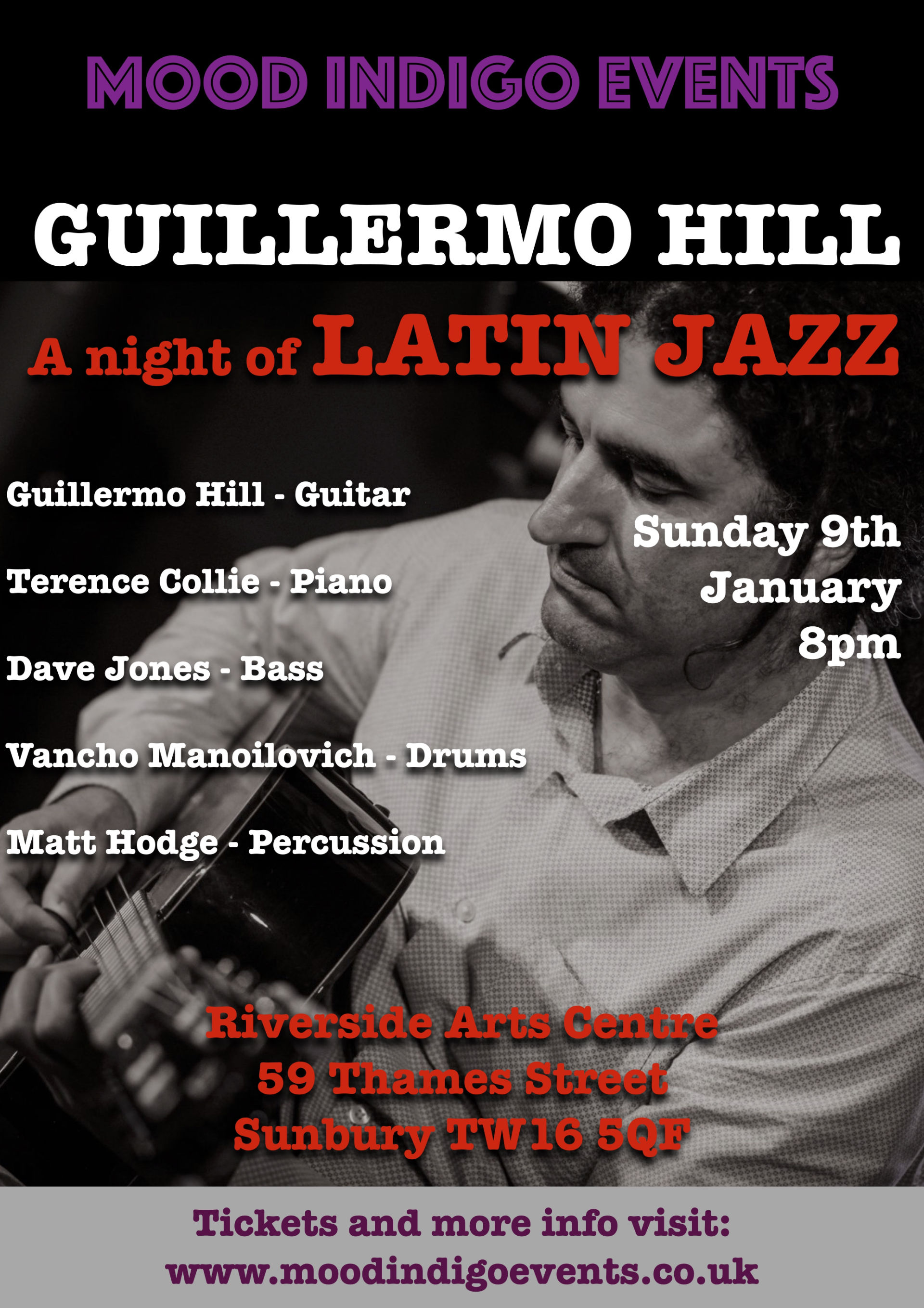 A night of Latin Jazz with Guillermo Hill on acoustic guitar and the Terence Collie Trio will be performed at the Riverside Arts Centre on Sunday 9th January at 8pm.