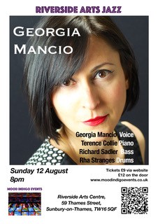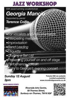 Janet McCann of Mood Indigo Events, well known to those who attend the fabulous evenings of jazz at the Riverside Arts Centre, is putting on a workshop in the afternoon of 12th August from 3 pm for 12 singers and instrumentalists run by Georgia Mancio followed by a concert with Georgia and trio in the evening which will be starting at 8, slightly later than normal.