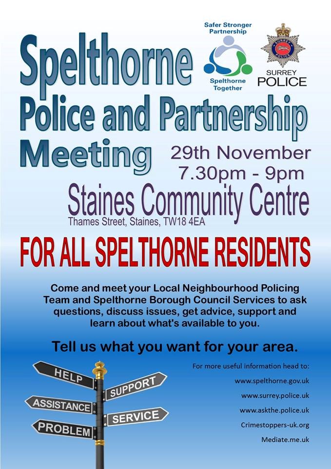 If you have concerns about your neighbourhood and would like to have your say, why not come to the Spelthorne Police and Partnership Meeting on 29th November at the Staines Community Centre.