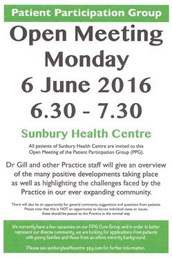 The next open meeting of the Patients' Participation Group will be held at the Sunbury Health Centre from 6.30pm - 7.30pm on Monday 6th June.